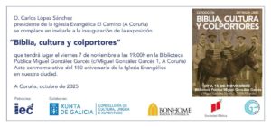 La Iglesia Evangélica El Camino (A Coruña) se complace en anunciar la inauguración de la exposición temporal “Biblia, cultura y colportores”, una muestra que forma parte de los actos conmemorativos por el 150 aniversario de la presencia de la Iglesia Evangélica en la ciudad de A Coruña.