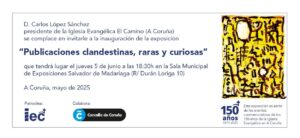 Con motivo del 150 aniversario de la Iglesia de Asambleas de Hermanos El Camino, el pasado jueves, 5 de junio se ha inaugurado la exposición “Publicaciones clandestinas, raras y curiosas”, que forma parte de los eventos conmemorativos de esta importante celebración.
