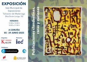 El próximo, domingo, 15 de junio de 2025 a las 18:00 h. tendrá lugar una visita guiada por la Exposición «Publicaciones clandestinas, raras y curiosas», sita en la Sala Municipal de Exposiciones Salvador de Madariaga en Durán Loriga 10, A Coruña a cargo del comisario de la exposición, José Luis Fernández Carnicero. La entrada es gratuita y el acceso es libre hasta completar aforo.